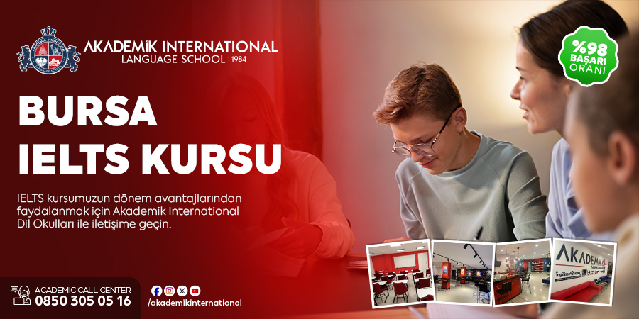 Dünyada pek çok kurum ve kuruluş tarafından kabul edilen IELTS Sınavı akademik ve seyahat işlemlerinde bireye birçok avantaj kazandırıyor. Zamanın en önemli unsur olduğunu düşünürsek bu sınavda ilk seferde başarı elde etmek oldukça mühimdir. Bu Bursa IELTS Kursu olarak sizlere sunduğumuz ücretsiz seviye tespit sınavından sonra , dil seviyenize en uygun eğitim programlarını uygulamaktayız. Yarım asra yakın tecrübemize güvenebilir ve Akademik ailesi ile birlikte kariyerinizi inşa etmeye başlayabilirsiniz.